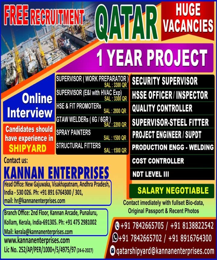 Shift in Charge, Snr. QA/QC Engineer, QA/QC Engineer, Fabrication Supervisor, Mechanical Supervisor Static, Supervisor Logistic, Quantity Surveyor, Senior Analyzer Technician,