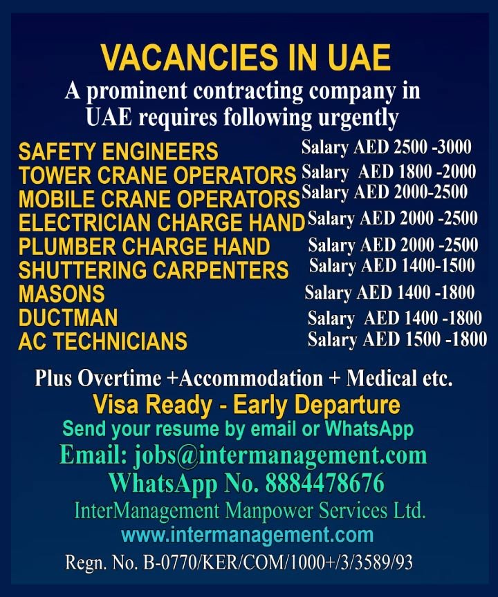 front-overseas#uae #safetyengineer #towercraneoperators #mobilecraneoperators #electricianchargehand #plumberchargehand #shutteringcarpenter #masons #ductman #actechnicians By PREM LAL / March 8, 2025